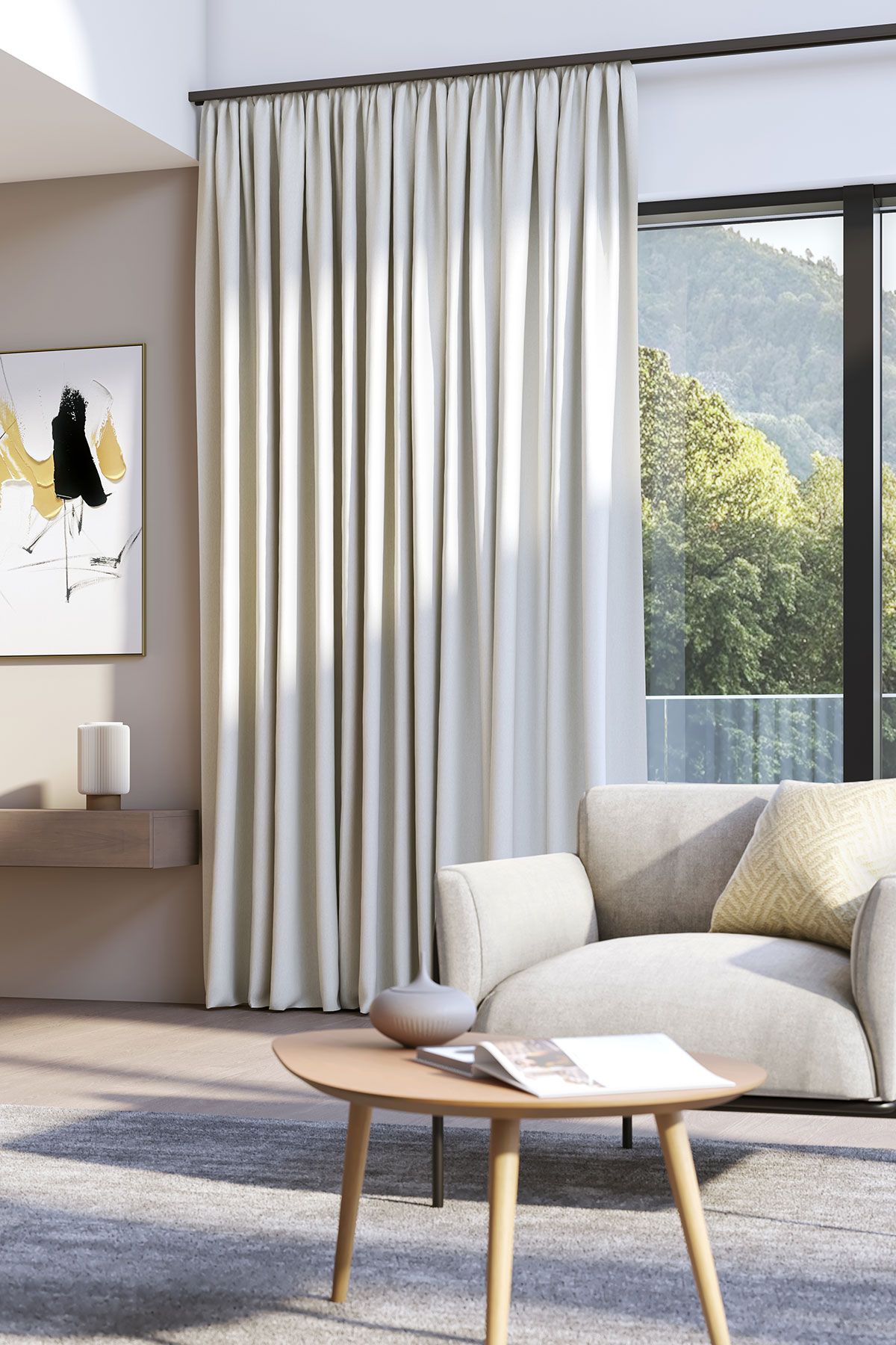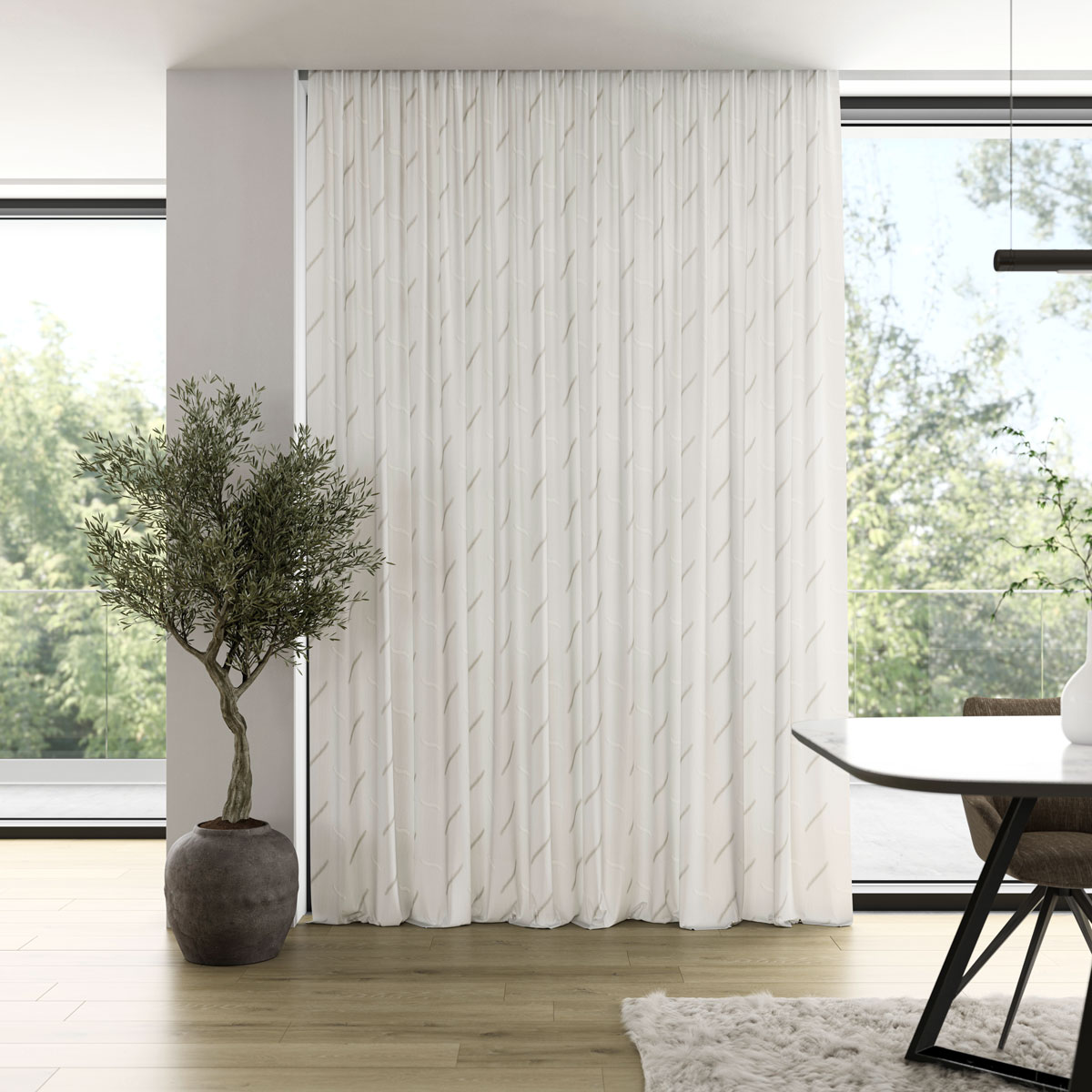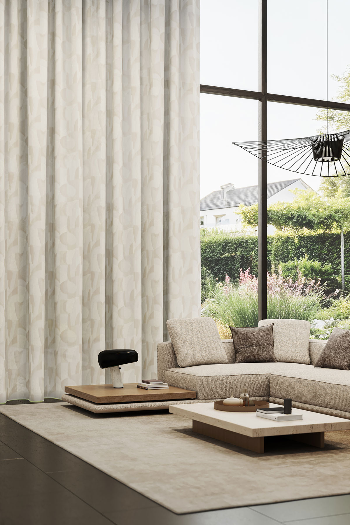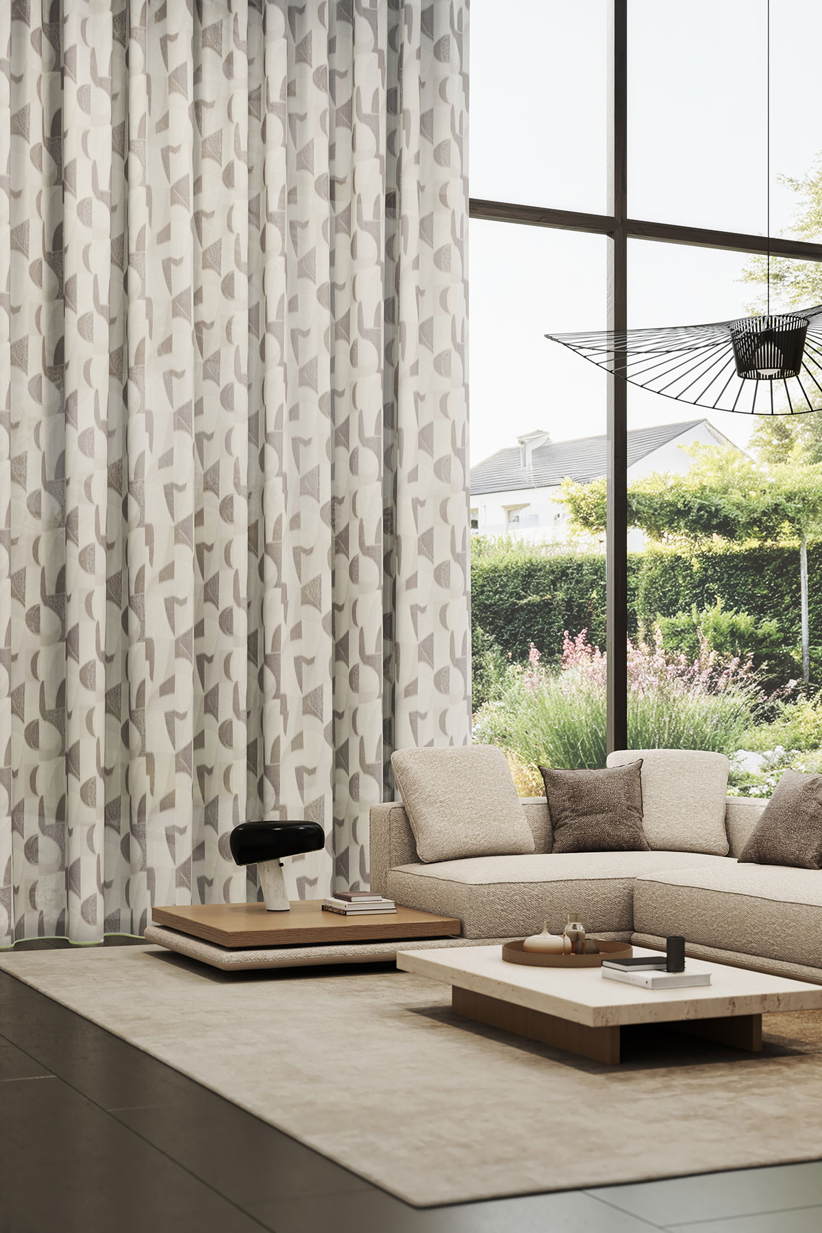 Berina begeistert mit einem dezenten Scherli-Muster, das Struktur und Leichtigkeit harmonisch vereint. Als raumhoher Inbetween sorgt Berina für eine sanfte Lichtstimmung und ist in drei stilvollen Farben erhältlich – ideal für eine moderne Fensterdekoration mit textilem Charakter.