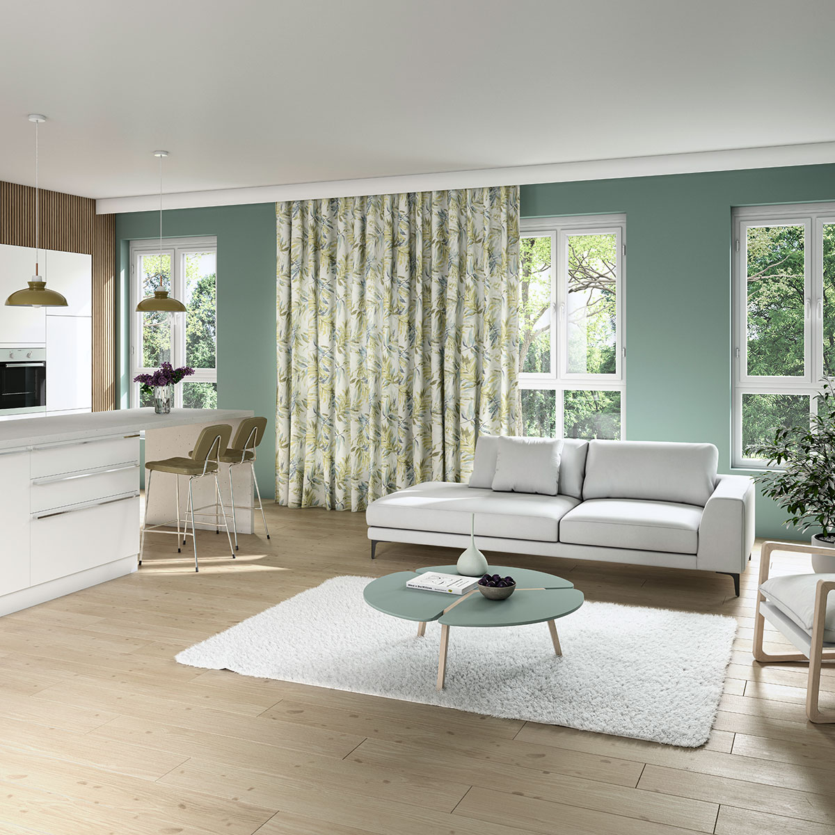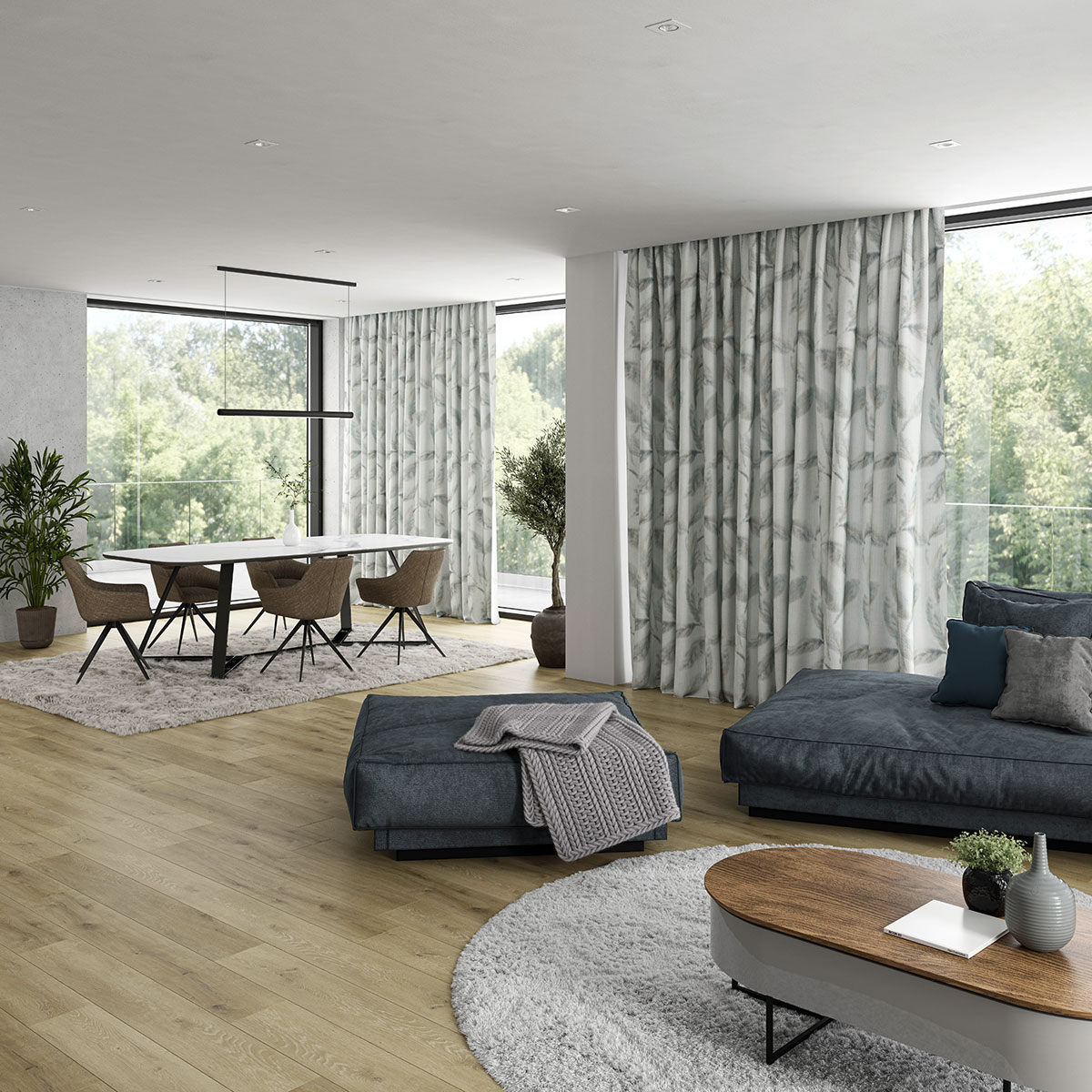 Mit Luna 2 bieten wir Stoffe, die inspirieren. Denn kühle Aqua-Farben und vielfältige Muster laden zum Schwelgen ein. Ob Blattmotive in verschiedensten Webarten oder geometrische Designs mit spannenden 3D-Effekten durch Flauschgarn machen Lust aufs Einrichten. Eine funktionale Kombi aus flammhemmendem Store und Deko ist ebenso dabei.