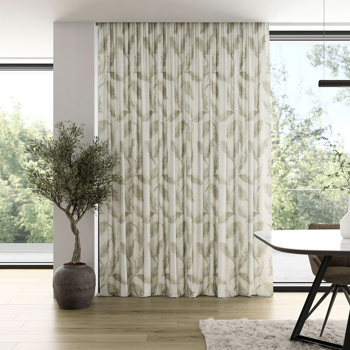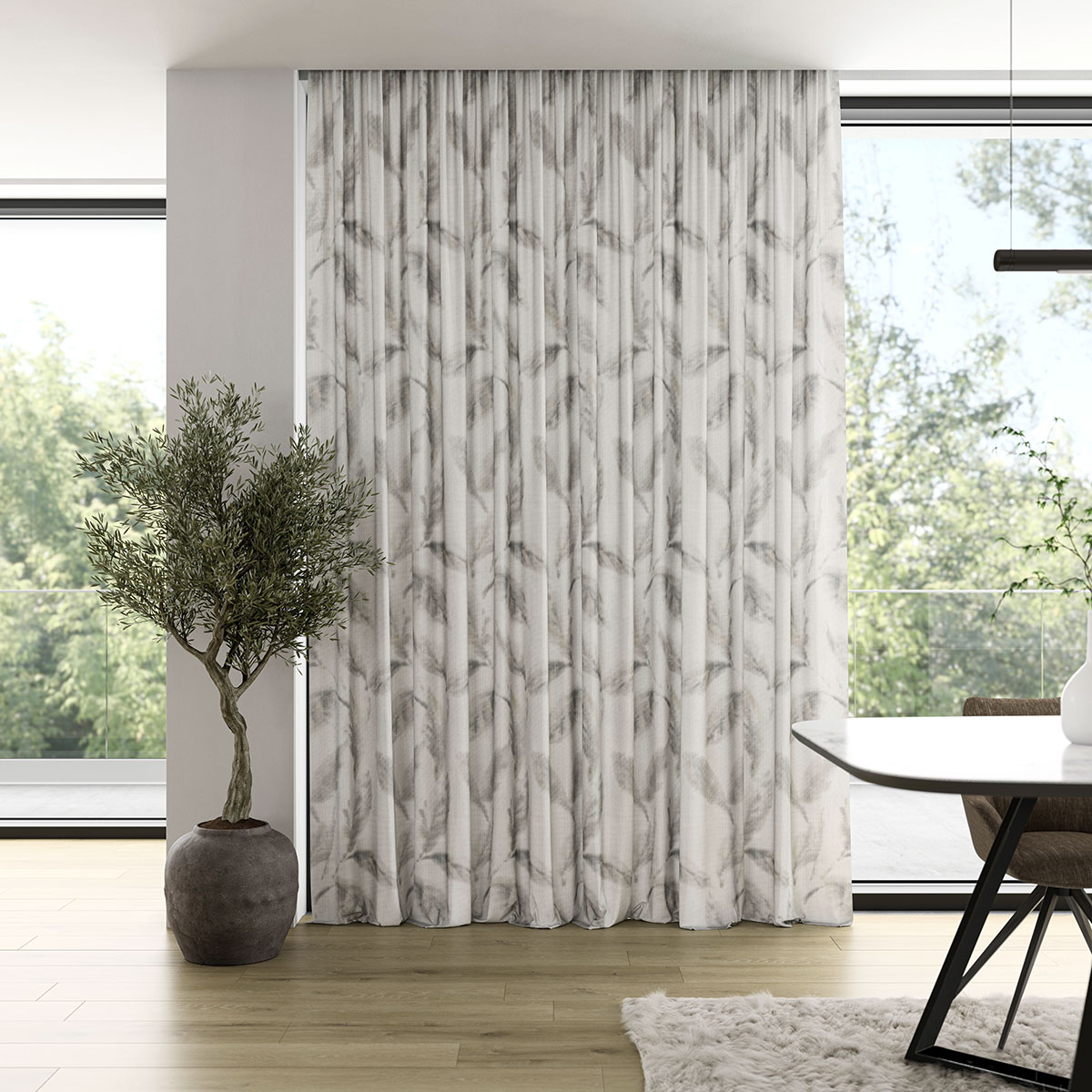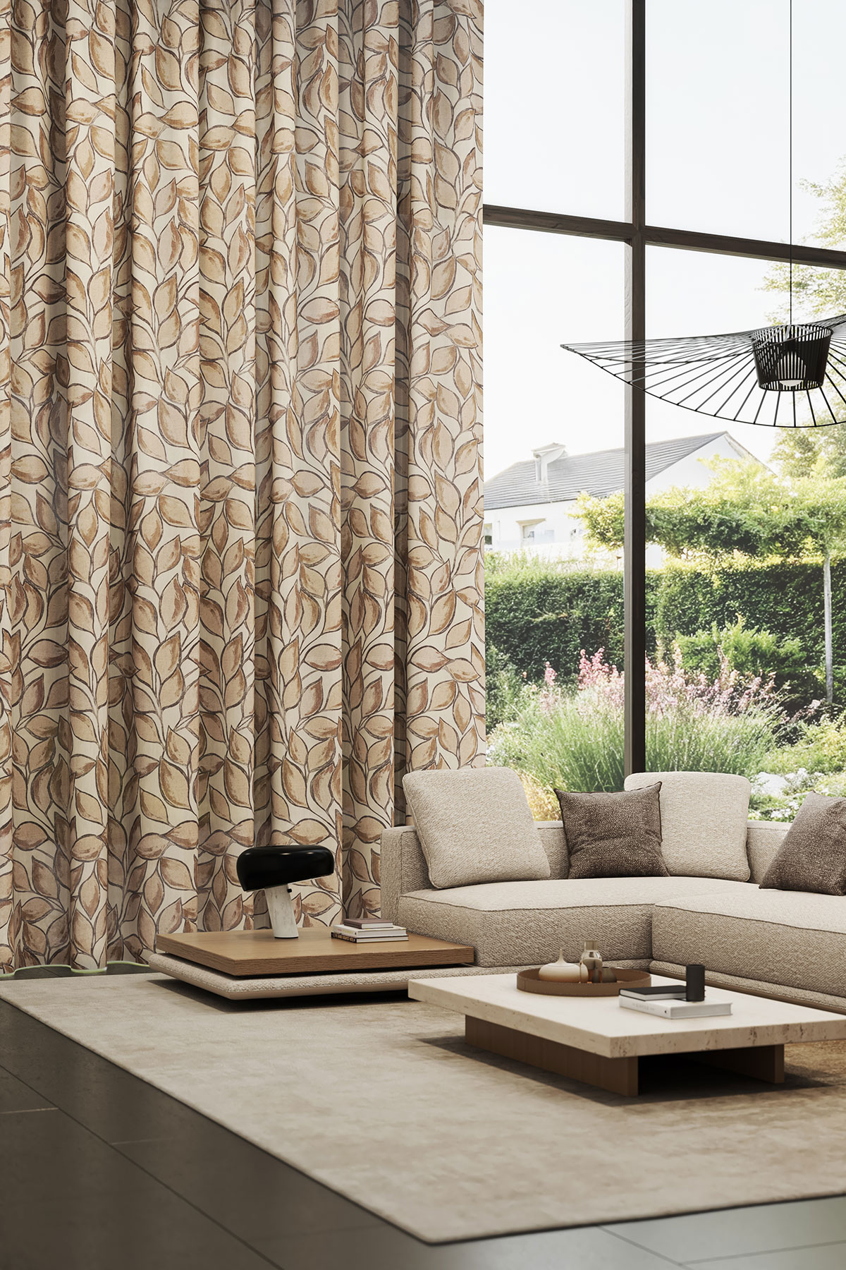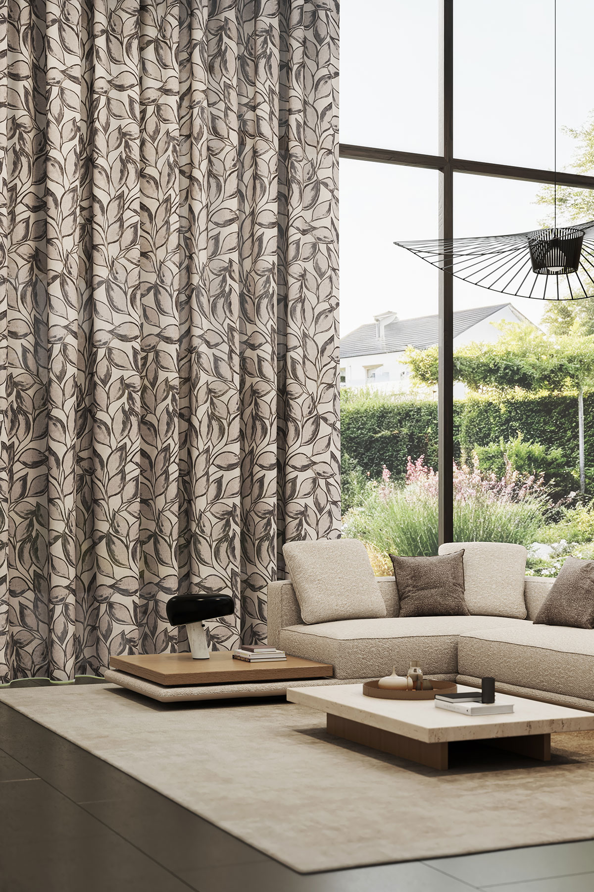 Fabia & Fabian – Mit ihrem abstrakten Blättermotiv im modernen Digitaldruck bieten Fabia und Fabian vielfältige Möglichkeiten für eine harmonische und stilvolle Raumgestaltung. Beide Stoffe sind raumhoch und in zwei naturnahen Farben erhältlich: Fabia als Gardine und Fabian als edler Deko-Satin.